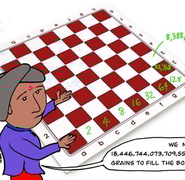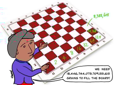 Once a poet delivering poems in a king’s palace, king and member of the king’s court enjoying his performance and praised him. In the honour, king decide it to give him some gold jewelry and coins, but he refused and said that to honour me just place a single grain of rice on first square of chessboard and double it for every square the amount of grain in last box is well rewarded.